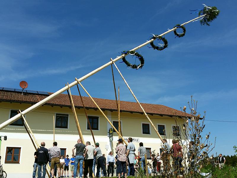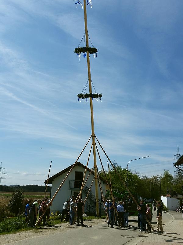 • Es haben sich viele Leute in Steinbach eingefunden, um bei schönem Wetter den Baum in die Höhe zu bringen.