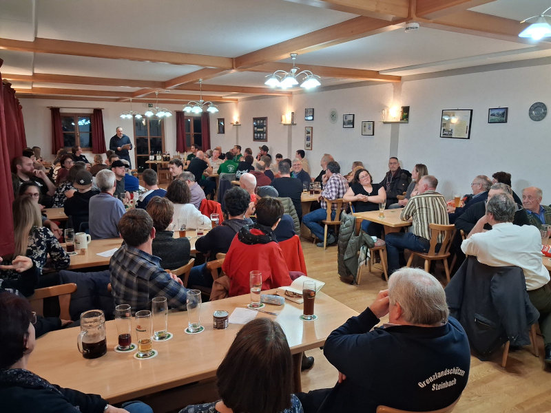 Martin Freudenreich, Schützenmeister der Grenzlandschützen Steinbach, eröffnete den Abend mit der Begrüßung der Gäste. Er betonte die Besonderheit, dass die Grenzlandmeisterschaft dafür ins Leben gerufen wurde, um einen Austausch unter den grenznahen Vereinen zu organisieren. Geschossen wurde auch dieses Mal nur zehn Schuss auf Ring-Teiler-Wertung. Ob Luftgewehr, Luftpistole oder LG-Auflage – jeder konnte sich an dem Schießen beteiligen. Insgesamt nahmen genau 100 Schütz/innen an der Meisterschaft teil, wobei der Saal in der Gaststätte Nitzl sehr gut gefüllt war. Natürlich gab es bei der grenzüberschreitenden Zusammenkunft auch dieses Mal für jeden Verein einen Preis zu gewinnen. Die wunderschöne Meisterscheibe konnten bei der 7. Grenzlandmeisterschaft die Grenzlandschützen Steinbach bereits das zweite Mal für sich gewinnen. Den 2. Platz sicherten sich die Altschützen Baierbach und der 3. Platz ging an die Eichenlaubschützen Wambach. Der gemütliche Gesellschaftsabend machte für kurze Zeit die oberbayerisch-niederbayerische Grenze vergessen und sorgte für viele Gespräche und einen regen Austausch unter den Vereinen. Die Rangliste der Grenzlandmeisterschaft war dabei schnell zweitrangig. Somit wurde wieder einmal das eigentliche Ziel erreicht – nämlich die Schützenvereine über die Gau- und Bezirksgrenze hinweg zu einem Austausch und zum Feiern zusammen zu bringen. Trotz des frühen Beginns um bereits 18 Uhr blieben die Gäste noch bis weit in die Nacht hinein in Steinbach sitzen. Nachdem bisher fünf Vereine auf der Scheibe verewigt sind, freuen sich die Teilnehmenden auf die nächste Grenzlandmeisterschaft, um auch ihren Verein auf der Scheibe anbringen zu können und natürlich darauf, einen schönen Abend in Steinbach zu verbringen.