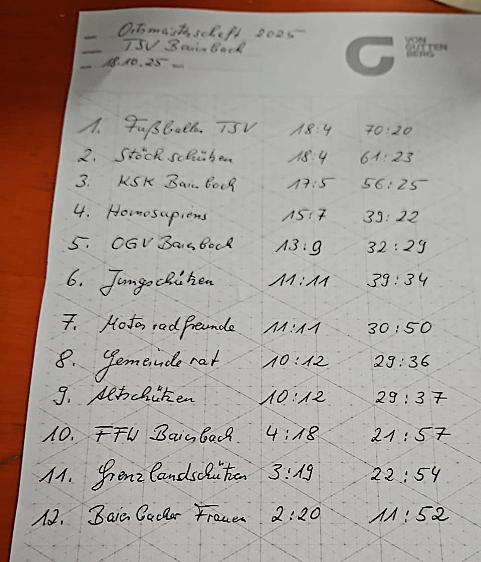 Am Samstag, den 18. Oktober 2025 fand in Baierbach die traditionelle Ortsmeisterschaft im Stockschiessen statt. Auch in diesem Jahr beteiligten sich an dem beliebten Turnier wieder zwölf Vereine aus der Gemeinde Baierbach. Schön, dass die Damenmannschaft auch dieses Jahr wieder an dem Turnier teilgenommen hat. Das gesellige Stockturnier startete um 15:00 Uhr und wurde von einem durchwachsenen Herbstwetter begleitet. Die Mannschaft der Grenzlandschützen war jung und motiviert aufgestellt - konnte den 11. Platz für sich erringen. Mit einem Punkteverhältnis von 3:19 Punkten haben sich Stefan Luber, Patrick Schref, Thomas Brandlmeier und Andreas Angermeier sehr gut geschlagen. Im Anschluss an das Turnier gab es auch dieses Jahr ein gutes Essen für die Beteiligten im Sportheim. Das Turnier beweist, dass die Vereine in Baierbach gut aufgestellt sind und sich gerne an diesem Ereignis beteiligen.